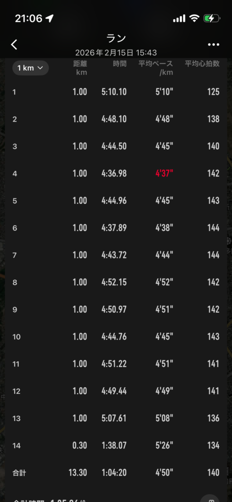 午後 10km 42分50秒くらい、最後の1.5kmくらいが15.5km/h